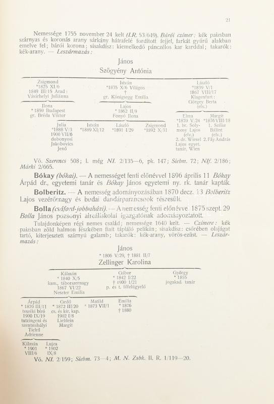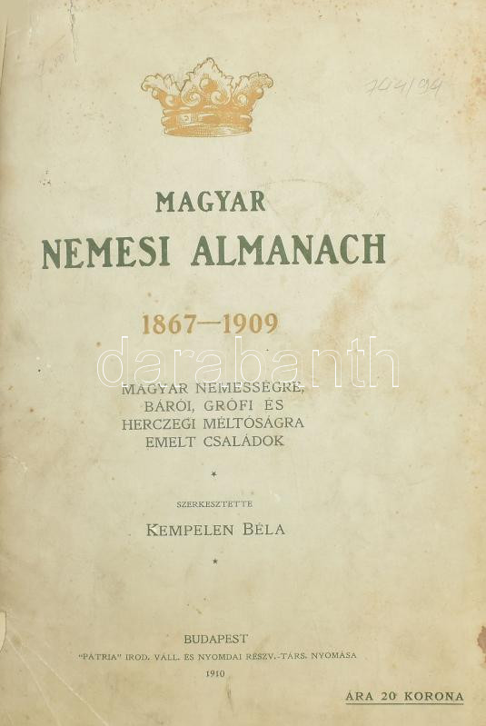 Magyar nemesi almanach az 1867-1909-ben magyar nemességre, bárói, grófi és herczegi méltóságra emelet családok. Szerk.: Kempelen Béla. Bp., 1910,"Pátria", 149 p. Átkötött modern egészbőr-kötésben, az eredeti javított papírborítókat bekötötték, a címlap és az elülső papírborító foltos.
