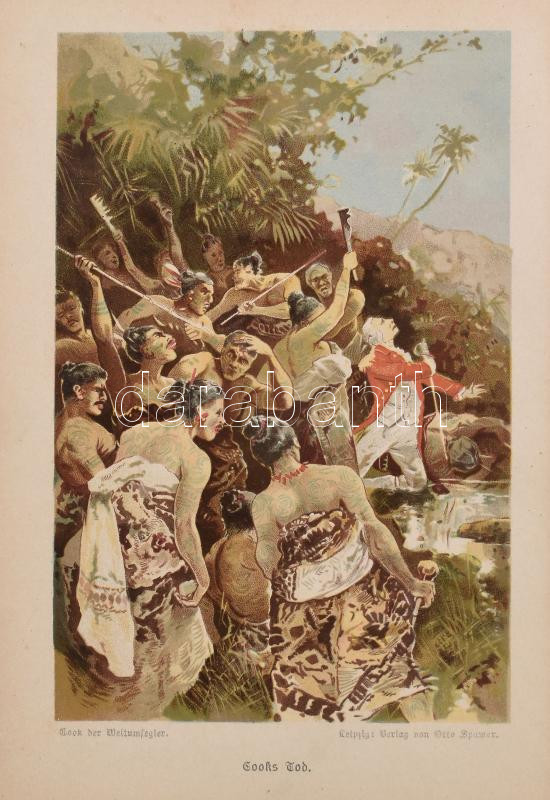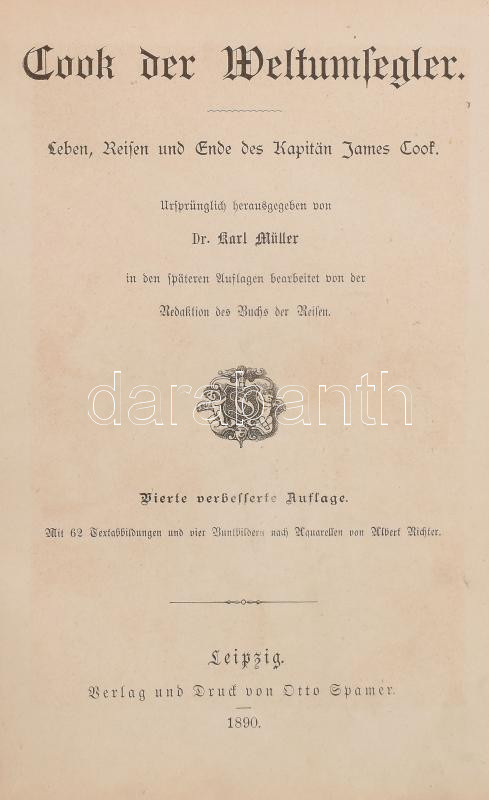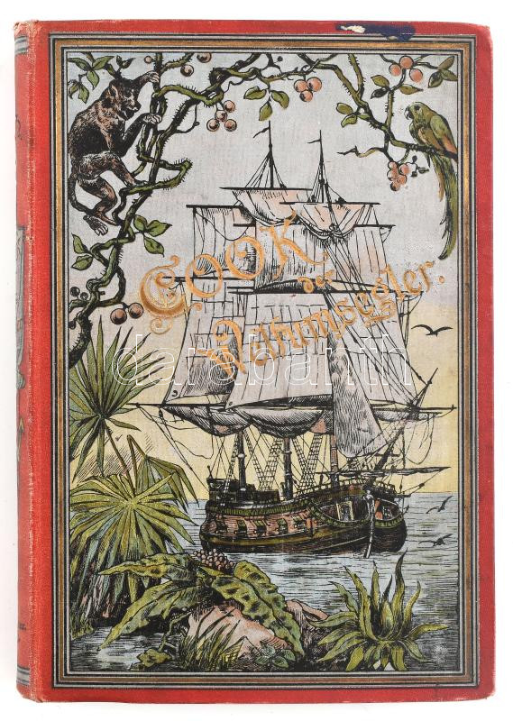 Karl Müller: Cook der Weltumsegler. Leben Reisen und Ende des Kapitän James Cook. Leipzig, 1890., Otto Spamer, VIII+294+2 p.+4 (chromolitográfiák) t. Szövegközti és egészoldalas fametszetekkel illusztrált. Német nyelven. Kiadói aranyozott, festett egészvászon-kötés, a borítón kopásnyomokkal, a felső lapéleken és az elülső borítón folttal.