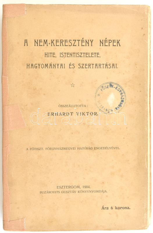 Beschreibung: A nem-keresztény népek hite, istentisztelete, hagyományai és szertartásai. Összeáll.: Erhardt Viktor. Esztergom, 1904, Buzárovits Gusztáv. Kiadói javított papírkötésben