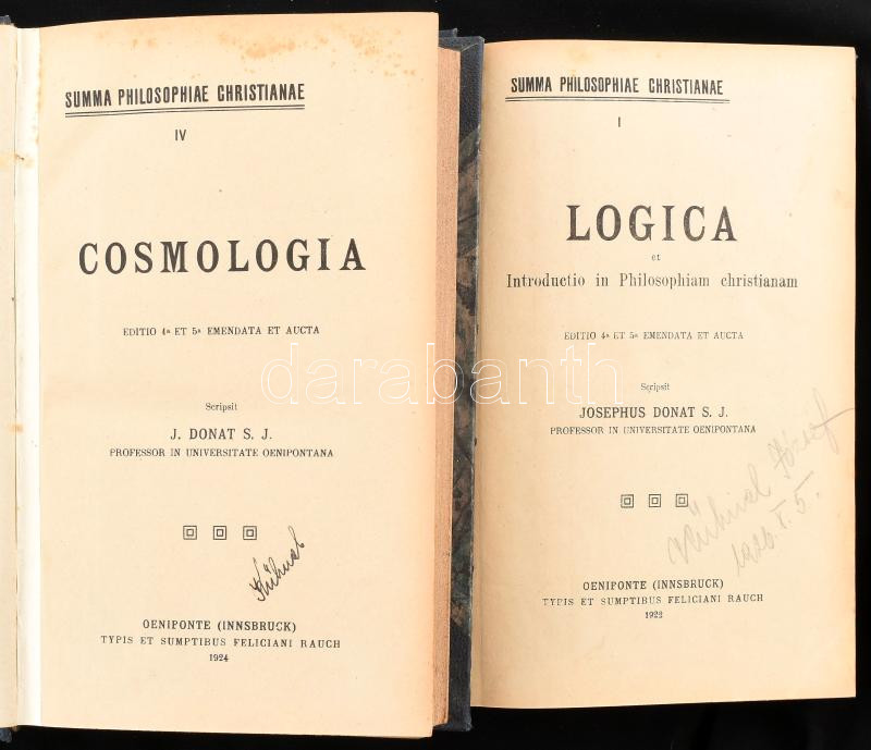 [Donat,Josef (1868-1946)] Josephus Donat S. J.: Summa Philosophiae Christianae I-V. I. köt. Logica et Introductio in Philosophiam christianam. II. köt.: Critica. III. köt. Ontologia. IV. köt.: Cosmologia. V. köt.: Psychologia. [Két kötetbe kötve.] Oeniponte (Innsbruck), 1923-1924-1921-1924-1923, Feliciani Rauch. Latin nyelven. Átkötött félvászon-kötések, aláhúzásokkal, bejegyzésekkel.