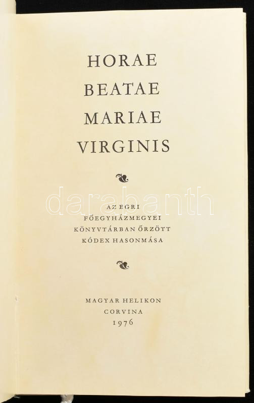 Horae Beatae Mariae Virginis. I-II. köt. Az Egri Főegyházmegyei Könyvtárban őrzött kódex hasonmása. Iványi Sándor és Dercsényi Dezső tanulmányaival. Bp., 1976, Magyar Helikon-Corvina. Kiadói műbőr-/papírkötés, kiadói papír védőborítóban, kiadói kartontokban.