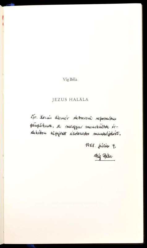 Víg Béla: Jézus halála. H.n., 1972, szerzői magánkiadás. Emigráns kiadás. Kiadói kartonált papírkötés. A szerző által Dr. Kocsis Elemér debreceni református püspök részére DEDIKÁLT példány.