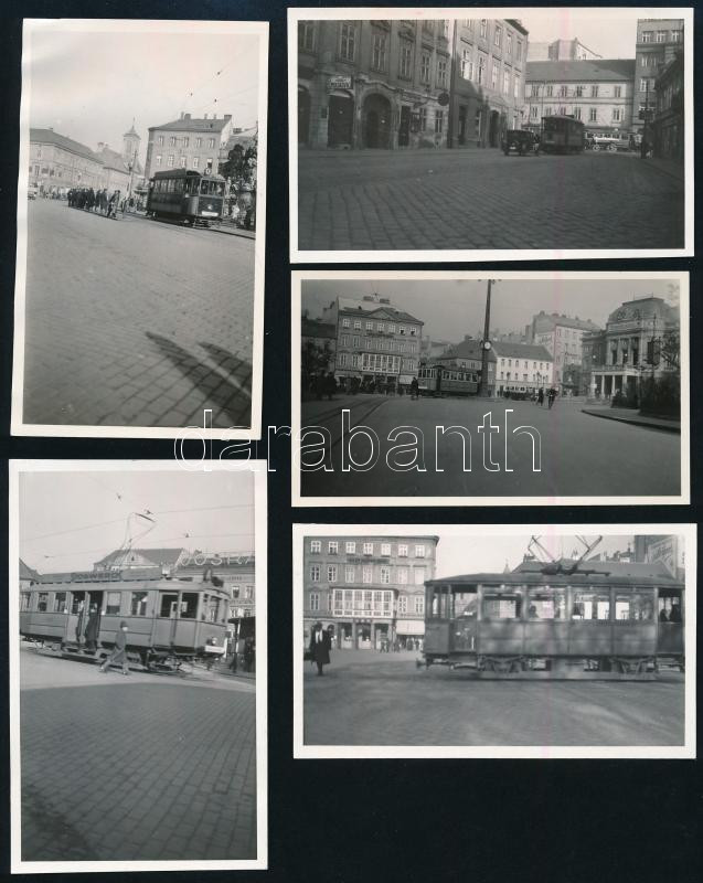 Beschreibung: 1932 Pozsony, utcaképek villamosokkal, 5 db fotó, némelyik hullámos, hátoldalon feliratozva, 11×6,5 cm / Bratislava, 5 photos with faults