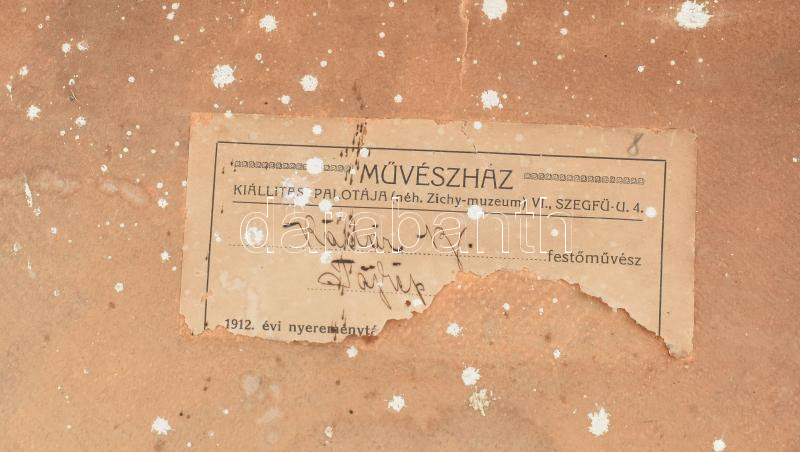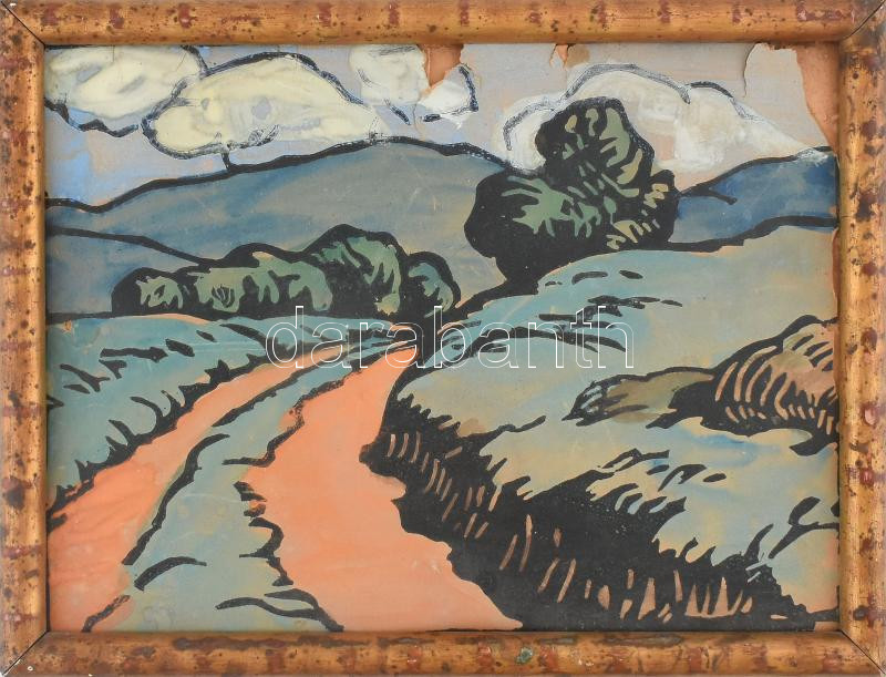 Kádár Béla (1877-1956): Táj. Akvarell, papír, jelzés nélkül, hátoldalán a Művészház 1912. évi töredékes kiállítási raglapjával. Művészház nyereményjátékán elnyert alkotás. Fakeretben. 24×32 cm