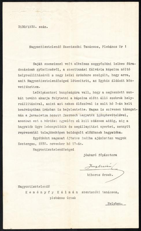 1930 Serédi Jusztinián (1884-1945) bíboros által saját kézzel aláírt érdekes levél Keménfy Kálmán plébános, tanár, egyházi író részére, hajtásnyommal, jó állapotban