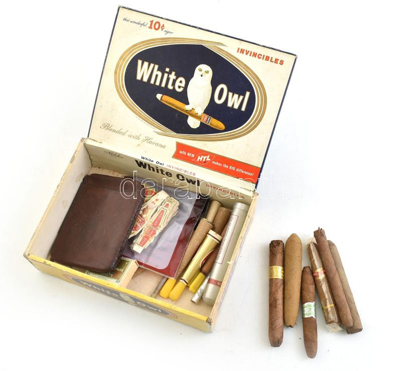 Régi szivardoboz (White Owl), benne 6 db szivar, bőr szivartartó tárca... https://www.darabanth.com/de/433-Fernauktion/433.0/Kunst-Dokumente-andere-Sammelgebiete/Flohmarkt~500012/Regi-szivardoboz-White-Owl-benne-6-db-szivar-bor-szivartarto-tarca-szipkak-szivarcimkek~II2792404
