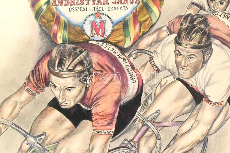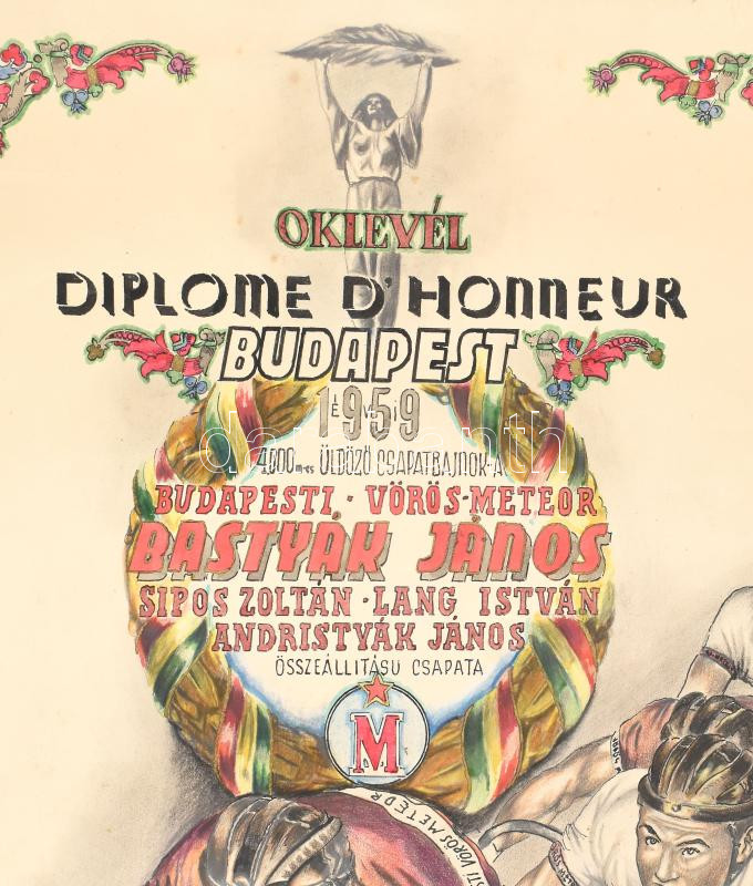 1959 Kézzel rajzolt kerékpáros verseny oklevél budapesti a 4000 méteres üldözőverseny főiskolai csapatvilágbajnoki versenyről Bascsák János (1929-2009) részére kis beszakadásokkal / Hand drawn bycicle contest warrant 42x60 cm