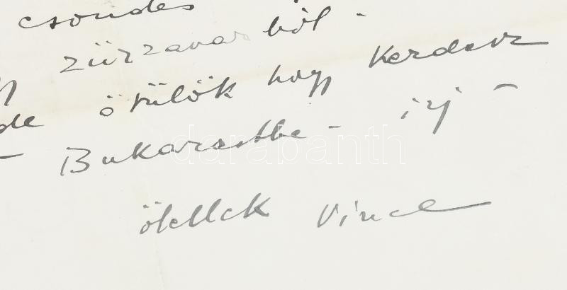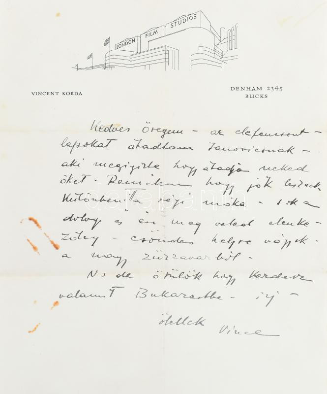 cca 1940 Vincent Korda (1897-1979) díszlettervező saját kézzel írt sorai Szolnay Sándor (1893-1950) festőművész részére, London Film Studios fejléces papírján, saját kezű aláírásával. ,,Az elefántcsont lapokat átadtam Janovicsnak (Janovics Jenő (1872-1945) színész, színigazgató, forgatókönyvíró), aki megígérte, hogy átadja neked őket. Remélem hogy jók lesznek. Különben itt a régi móka - sok a dolog és én meg veled ellenkezőleg - csöndes helyre vágyok a nagy zűrzavarból. No de örülök hogy kezdesz valamit Bukarestbe. Írj! Ölellek Vince."