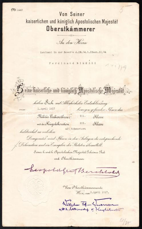 1917 Katonai szolgálati kereszt III, osztály adományozó oklevél https://www.darabanth.com/de/433-Fernauktion/433.0/Kunst-Dokumente-andere-Sammelgebiete/Militaria~500029/1917-Katonai-szolgalati-kereszt-III-osztaly-adomanyozo-oklevel~II2792430