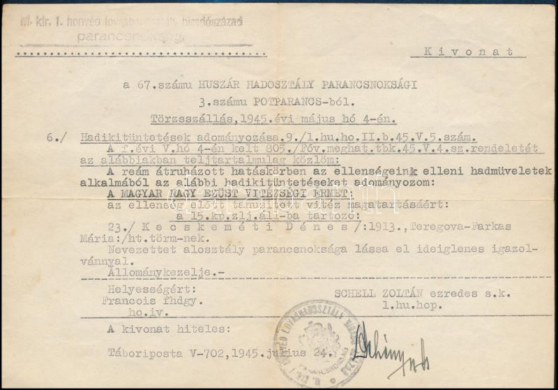 Beschreibung: 1945 július 24. kivonat a 67. számú Huszár hadosztály 3. számú pótparancsából Felterjesztés nagy ezüst vitézségi éremre tábori posta
