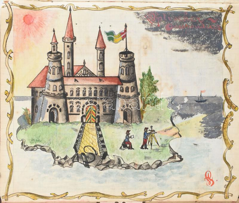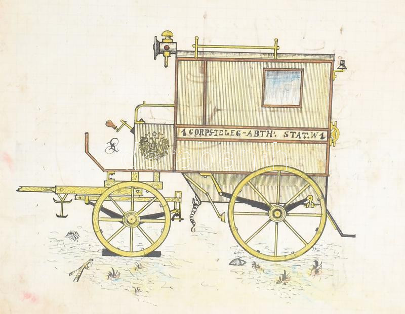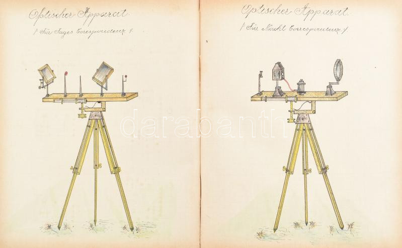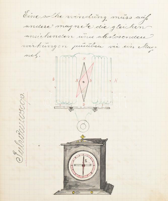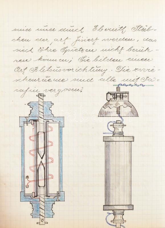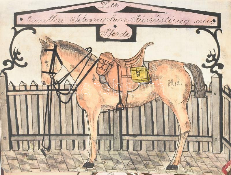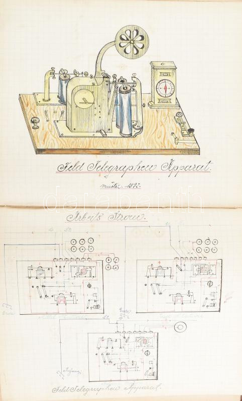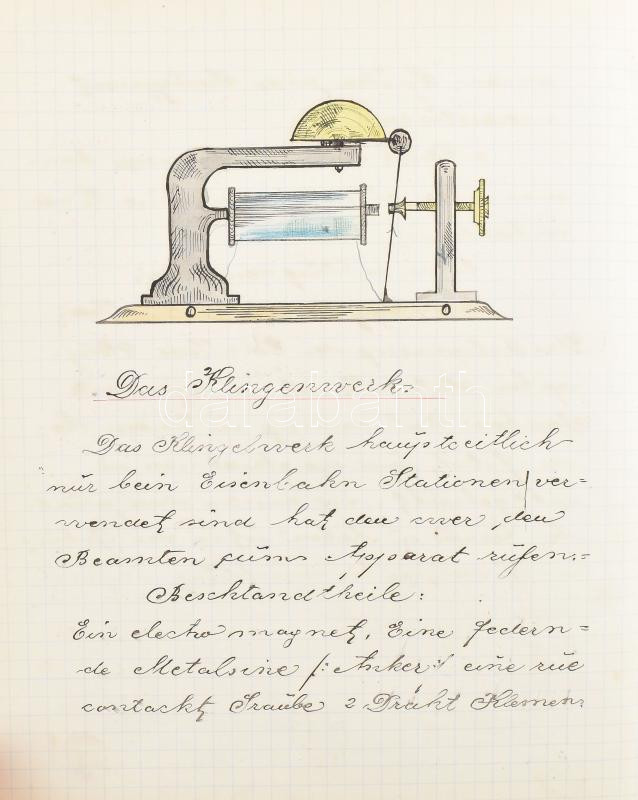 cca 1902-1903 "Theorie und Liniendienst des Josef Ladists. K. u. K. Cavallarie - Telegraphen Curs in Tulln 1903. Corp[oral]. i[n]. 12. Husaren R[e]giment. 1902-1903." Ladits József, feltehetőleg aradi származási katona, a 12. "Nádor" huszárezred tullni telegráf/távírász kurzusán részt vett tizedesének jegyzetkönyve. Igényesen, szép kézírással megírva, rendkívül gazdag színes, kézzel rajzolt képanyaggal illusztrált. A kötéstábla belsejéről feltehetőleg a katona képe hiányzik, de alatta a kurzus résztvevőinek fotólapja. Német nyelven. Aranyozott egészvászon-kötésben, kopott borítóval, sérült gerinccel.