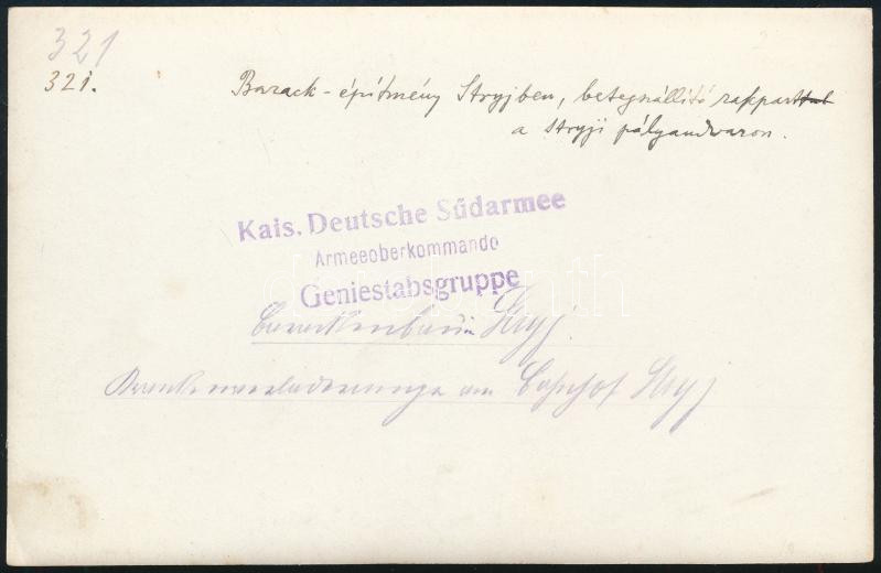 cca 1914-1918 "Barack-építmény Stryjben, betesgszállító rakpart a stryji pályaudvaron.", a hátoldalon feliratozott és pecséttel jelzett fotó (Kais. Deutsche Südarmee Armeeoberkommando Geniestabsgruppe), 12x17 cm