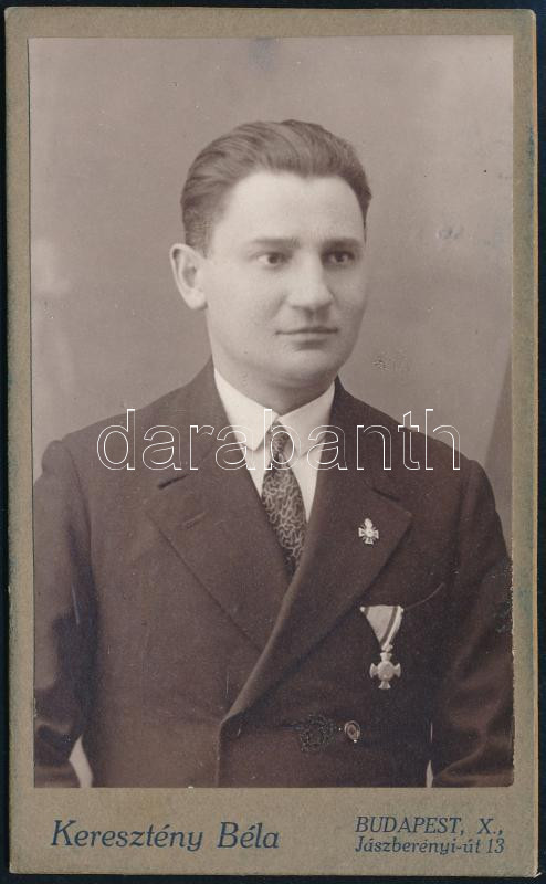 cca 1920 Katona polgári öltözetben, (Ezüst v. Arany) Érdemkereszttel, jelvénnyel; keményhátú fotó Keresztény Béla budapesti műterméből, vizitkártya, 10,5x6 cm