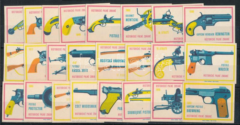 Beschreibung: 24 db fegyvereket ábrázoló gyufacímke