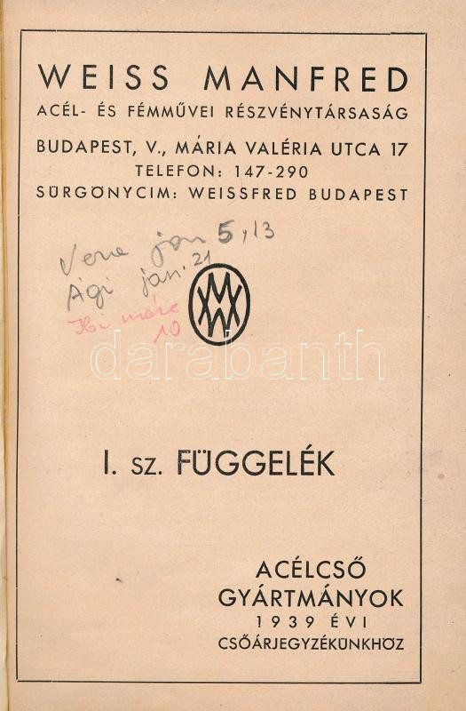 1939 Weiss Manfréd árjegyzék, képes. Acélcső gyártmányok 213p. Kiadói ... https://www.darabanth.com/de/433-Fernauktion/433.0/Kunst-Dokumente-andere-Sammelgebiete/Werbungen~500023/1939-Weiss-Manfred-arjegyzek-kepes-Acelcso-gyartmanyok-213p-Kiadoi-vaszonkotesben~II2796252