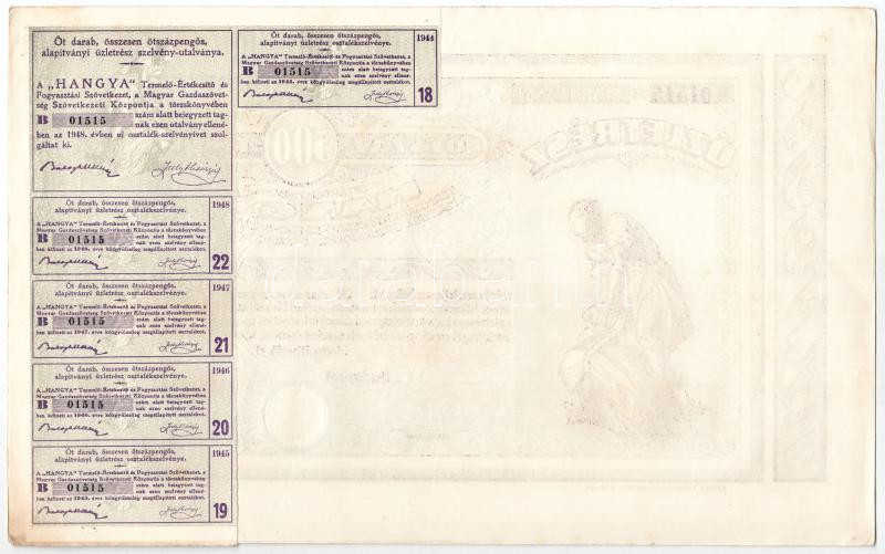 Beschreibung: Budapest 1939-1943. "Hangya Termelő-Értékesítő és Fogyasztási Szövetkezet" üzletrésze 100P-ről (2x) + 500P-ről + 1000P-ről (2x), szelvényekkel, szárazpecséttel T:II folt
