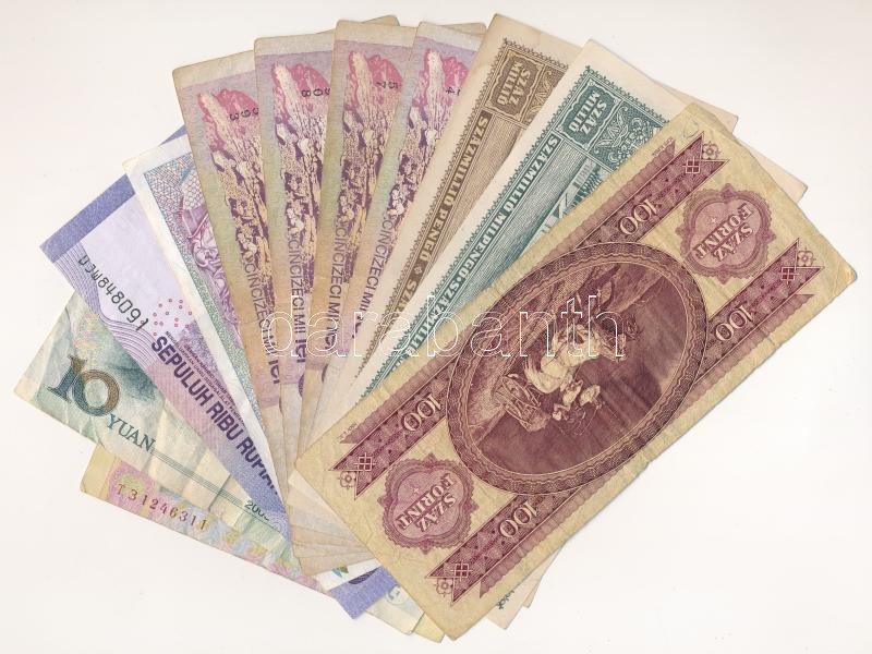 11db-os vegyes magyar és külföldi bankjegy tétel, közte Románia, Indonézia, Argentína, Ukrajna, Kína T:II--III- közte kis szakadás, folt 11pcs of mixed hungarian and foreign banknote lot, in it Romania, Indonesia, Argentina, Ukraine, China C:VF-VG small tear, spot among them