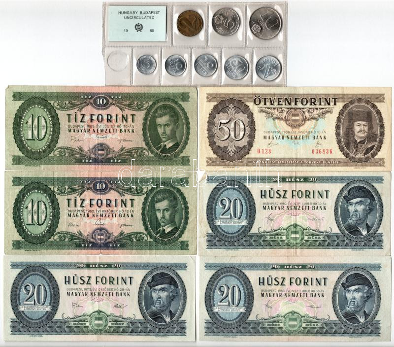 Beschreibung: 1962-1969. 10Ft (2xklf) + 1975. 20Ft + 1980. 20Ft (2x) + 1989. 50Ft + 1980. 5f-10Ft (8xklf) hiányos forgalmi sor fóliatokban T:III, 1 patina, a 2 filléres hiányzik