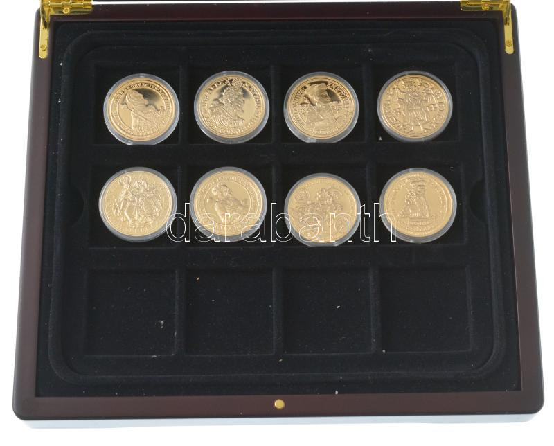 DN "A legértékesebb magyar érmék" 8xklf aranyozott Cu emlékérem kapszulában, 7 darab tanúsítvánnyal, kivehető tálcán, mahagóni fa éremtartóban (40mm) T:PP