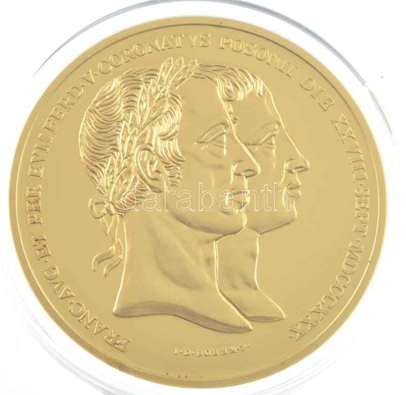 DN "Magyar Aranyóriások - V. Ferdinánd koronázási érem, 15 Dukát ... https://www.darabanth.com/de/433-Fernauktion/433.0/Numismatik/Moderne-Beischlage-Fantasiemunzen~2000010/DN-Magyar-Aranyoriasok-V-Ferdinand-koronazasi-erem-15-Dukat-1830-aranyozott-Cu-utanver~II2791101