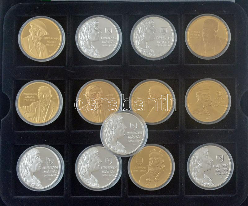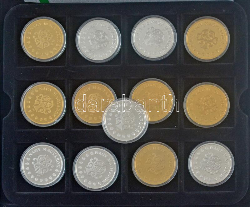 Beschreibung: ifj. Szlávics László (1959-) ~2011-2016. "Nagy Magyarok" aranyozott, illetve ezüstözött Cu emlékérmek (13db/8xklf), 10db tanúsítvánnyal mahagóni fa, bársonybéléses érmetartó kazettában, 1db kivehető tálcával (40mm/db) T:PP