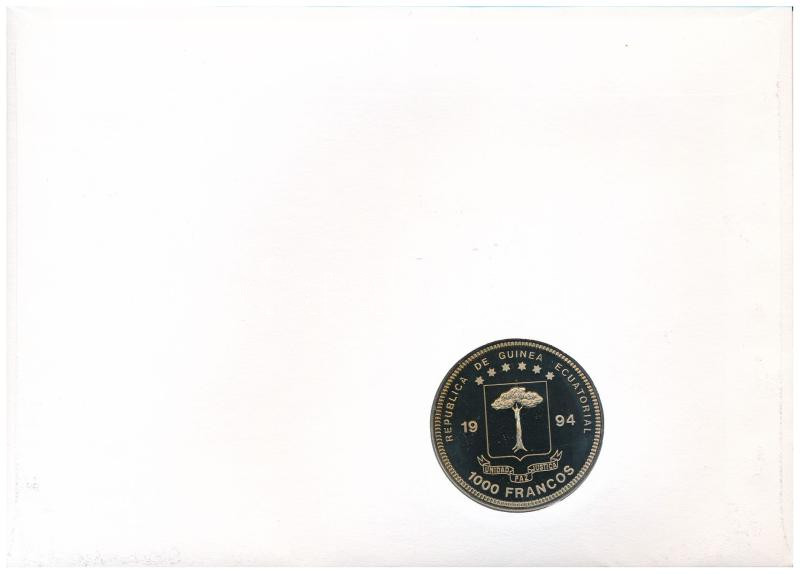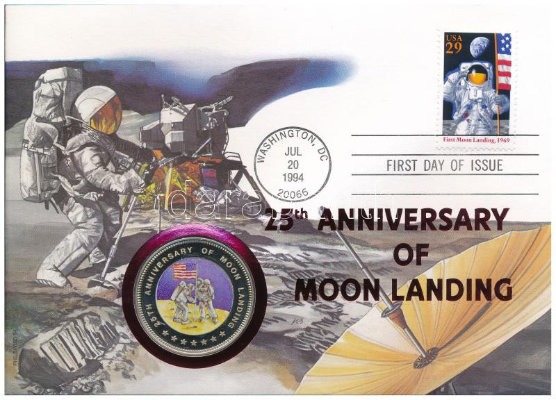 Amerikai Egyesült Államok 1994. "A Holdra szállás 25. évfordulója" boríték első napi bélyeggel, benne Egyenlítői-Guinea 1994. 1000Fr Cu-Ni multicolor, német nyelvű ismertetővel C:PP USA 1994. "25th Anniversary of Moon Landing" envelope with first day stamp and with coin Equatorial Guinea 1994. 1000 Francs Cu-Ni multicolor, with information text in German C:PP