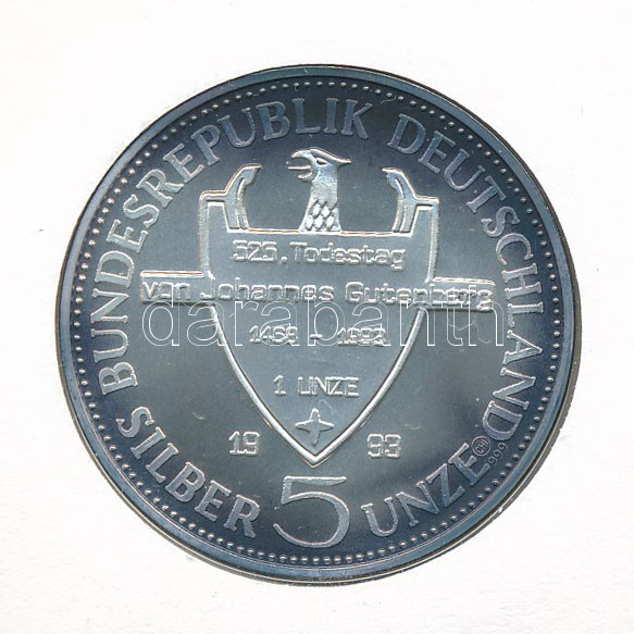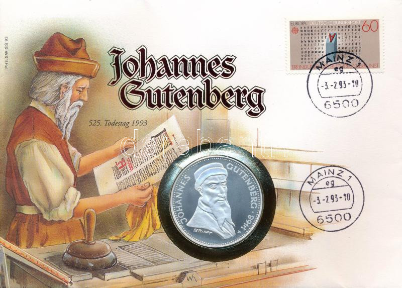 Németország 1993. "Johannes Gutenberg halálának 525. évfordulója" kétoldalas jelzett Ag emlékérem felbélyegzett borítékban (1uncia/0.999/40mm) T:1 patina