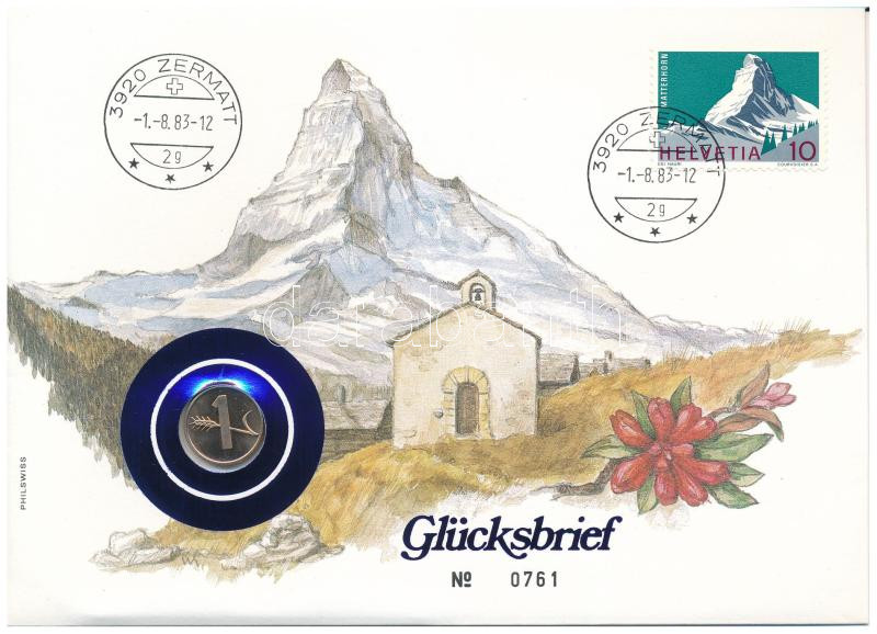Svájc 1982. 1r Br, "Glücksbrief" érmés borítékban, bélyeggel, bélyegzéssel, német nyelvű ismeretővel T:1Switzerland 1982. 1 Rappen Br, in "Glücksbrief" envelope with stamp, cancellaltion, and description in German C:UNC