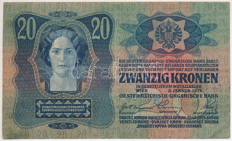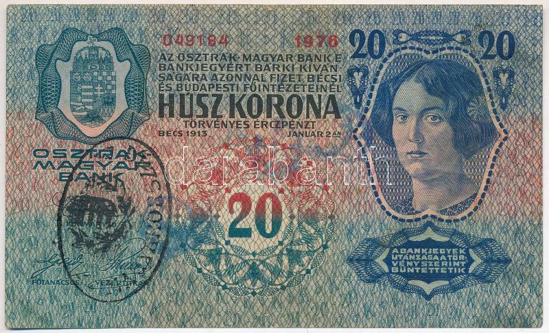 1913. 20K ovális, fekete "MAGYARORSZÁG" felülbélyegzéssel (h... https://www.darabanth.com/de/433-Fernauktion/433.0/Numismatik/Ungarische-Banknoten~2000015/1913-20K-ovalis-fekete-MAGYARORSZAG-felulbelyegzessel-hamis-es-egy-olvashatatlan-felul~II2758005