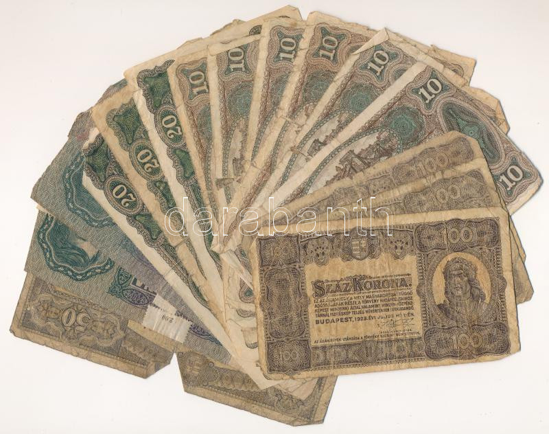 1915-1923. Vegyes 16db-os rossz tartású korona tétel T:III-,IV https://www.darabanth.com/de/433-Fernauktion/433.0/Numismatik/Ungarische-Banknoten~2000015/1915-1923-Vegyes-16db-os-rossz-tartasu-korona-tetel-TIII-IV~II2789016