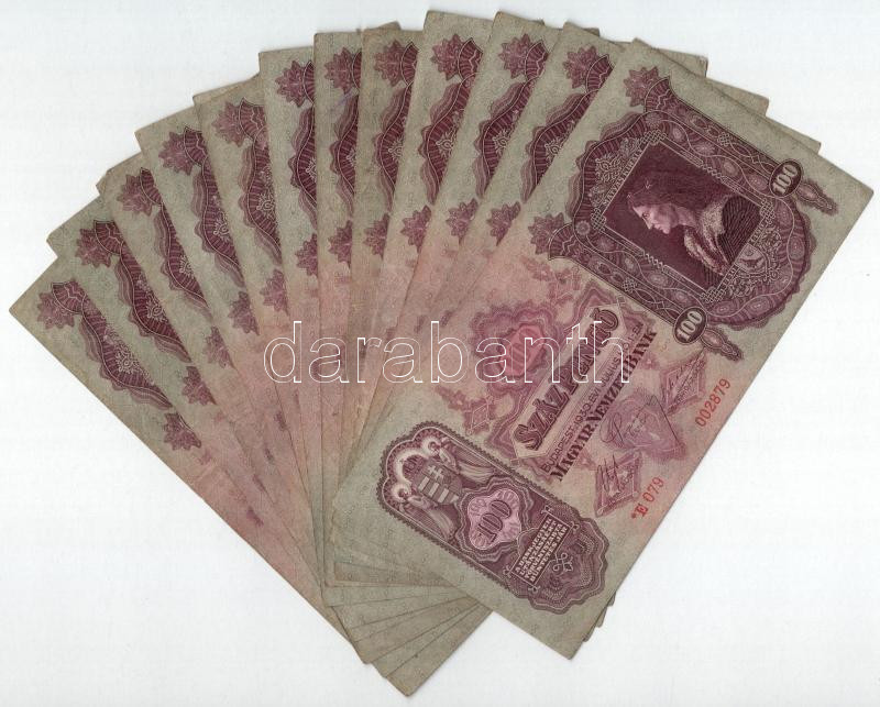 1930. 100P (12x) mind csillagos sorozatjellel T:III Adamo P17 https://www.darabanth.com/de/433-Fernauktion/433.0/Numismatik/Ungarische-Banknoten~2000015/1930-100P-12x-mind-csillagos-sorozatjellel-TIII-Adamo-P17~II2789709