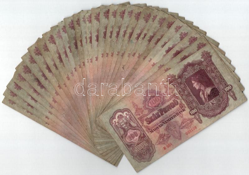 1930. 100P (30x) T:III,III- Adamo P17 https://www.darabanth.com/de/433-Fernauktion/433.0/Numismatik/Ungarische-Banknoten~2000015/1930-100P-30x-TIII-III-Adamo-P17~II2789673