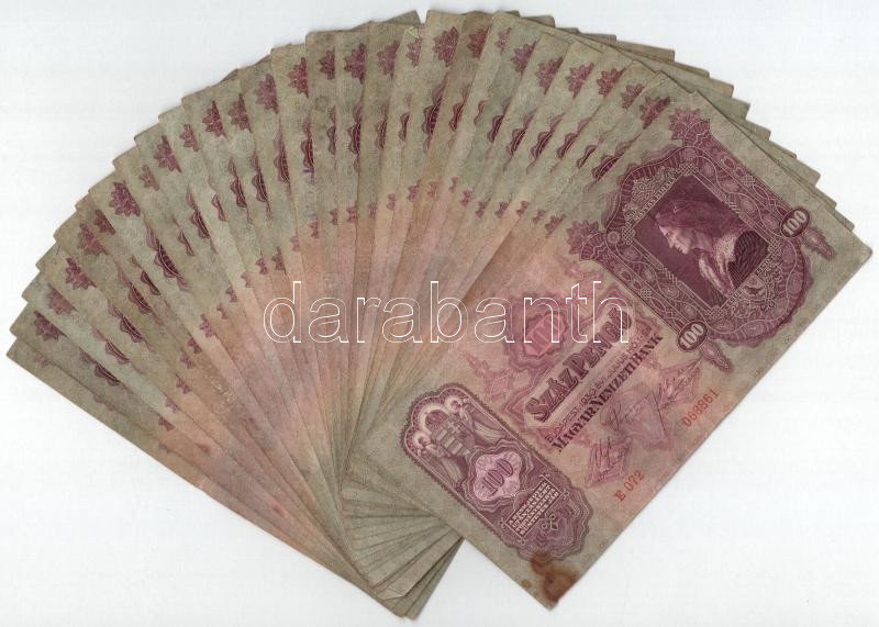 1930. 100P (30x) T:III,III- Adamo P17 https://www.darabanth.com/de/433-Fernauktion/433.0/Numismatik/Ungarische-Banknoten~2000015/1930-100P-30x-TIII-III-Adamo-P17~II2789676