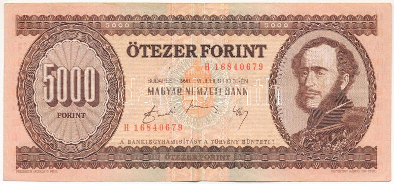 1990. 5000Ft "H 16840679" T:III Hungary 1990. 5000 Forint &q... https://www.darabanth.com/de/433-Fernauktion/433.0/Numismatik/Ungarische-Banknoten~2000015/1990-5000Ft-H-16840679-TIII-Hungary-1990-5000-Forint-H-16840679-CF-Adamo-F49~II2708519