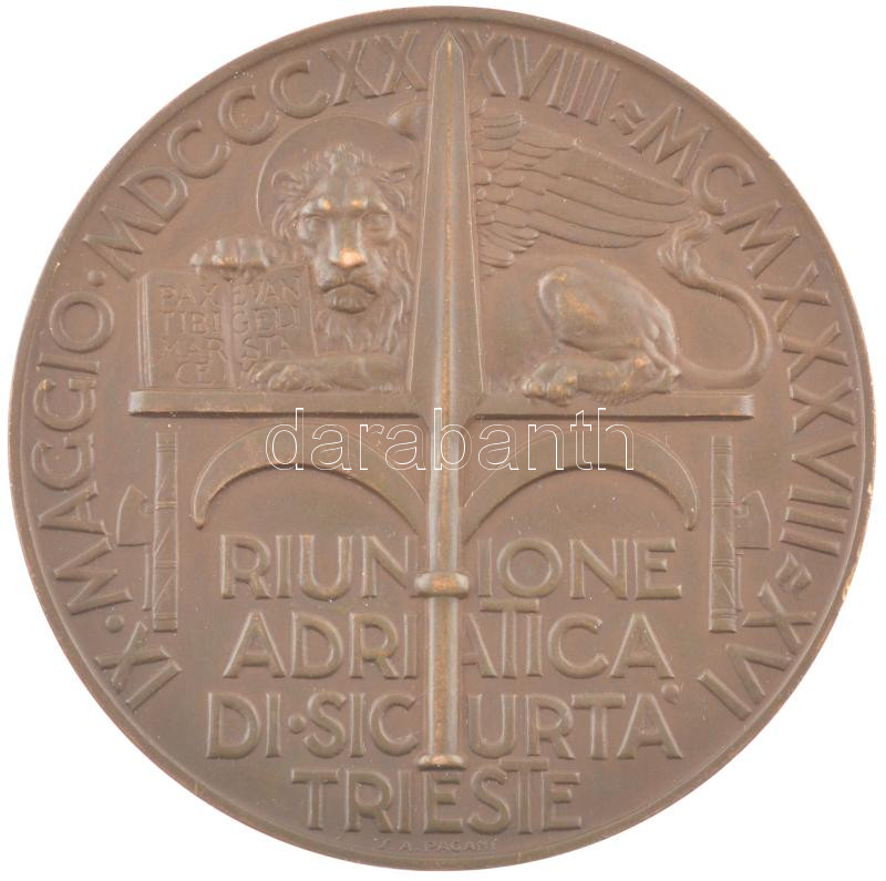 Italy / Triest 1938. "100th Anniversary of the Adriatic Insurance Company" two-sided bronze commemorative medallion. Sign:Mistruzzi / Pagani (57mm) C:AU