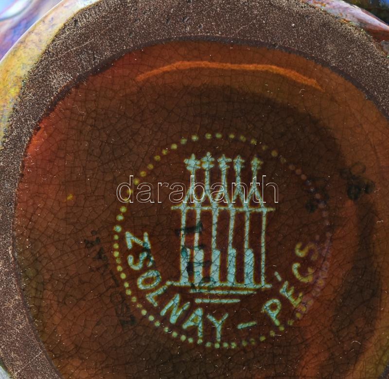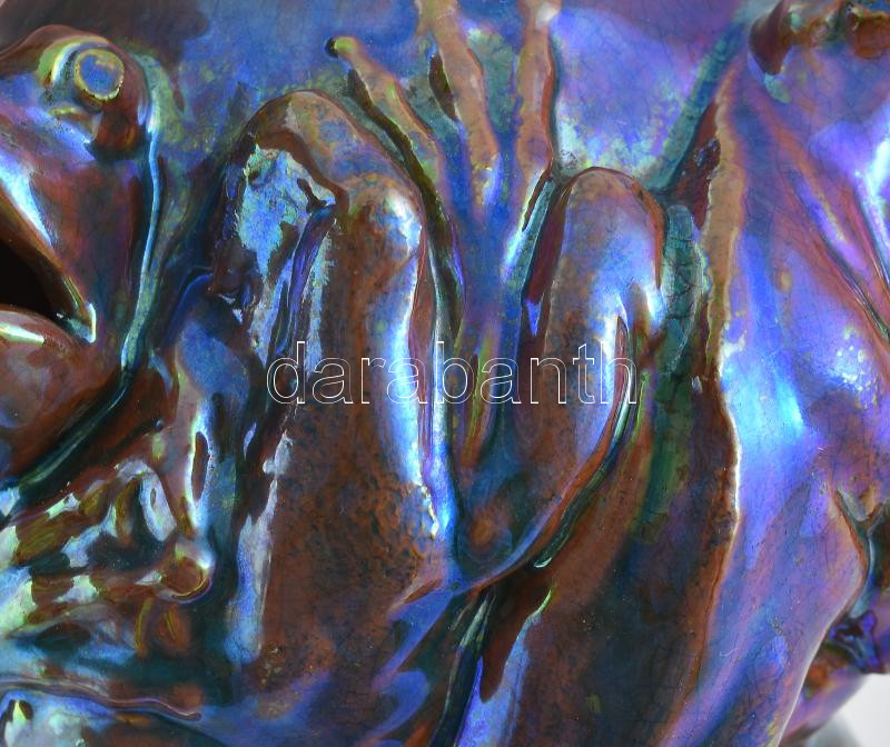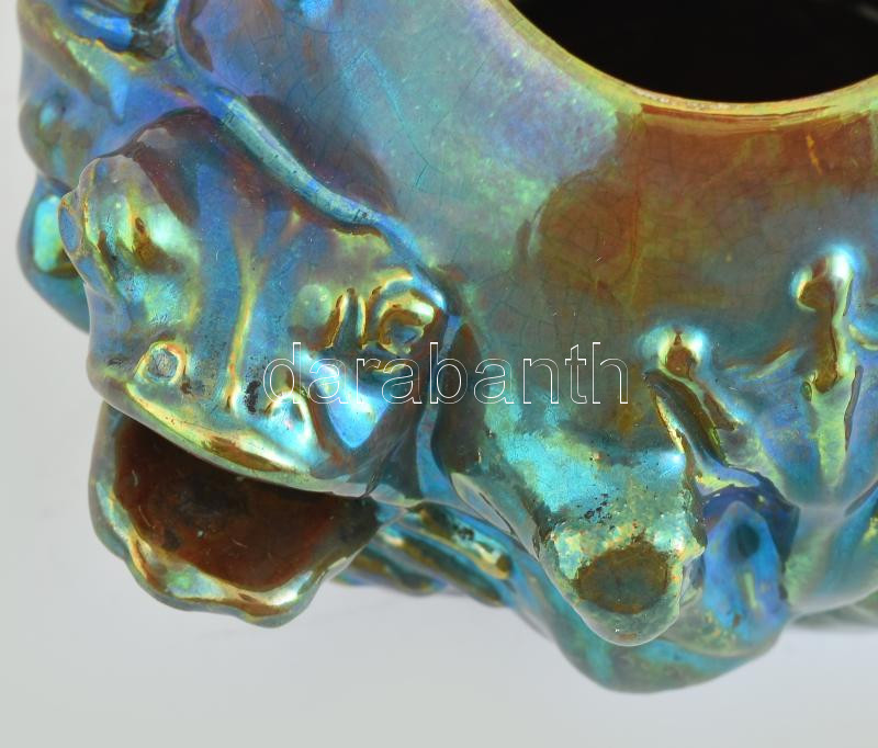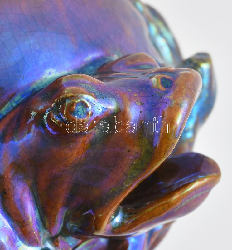 Zsolnay szecessziós békás váza, eozin mázas. Formába öntött és kézzel alakított fehércserép, oldalán reliefszerűen kidomborodó, plasztikus békákkal. Savmaratott felületén többrétegű, színes eozinmázakkal festve. Egyik béka szája restaurált. Mattyasovszky-Zsolnay László modellje, 1899. Alján masszába nyomott Zsolnay Pécs és 5771 (formaszám), valamint eozinnal festett, pontsoros, kerek, pecsétszerű márkajelzés. Zsolnay, Pécs, 1899. M.: 10,5 cm, átm.: 12 cm Analógia: Csenkey Éva - Gyugyi László - Hárs Éva: Zsolnay a nagyvilágban (Gyugyi László gyűjteménye). Helikon, 2006. 273. oldal, 544. sz. kép. Stattner Richárd és Csiba Mónika: ZSOLNAY A magyar szecesszió mesterművei. Elite Design Gallery, 2003. 86. oldal