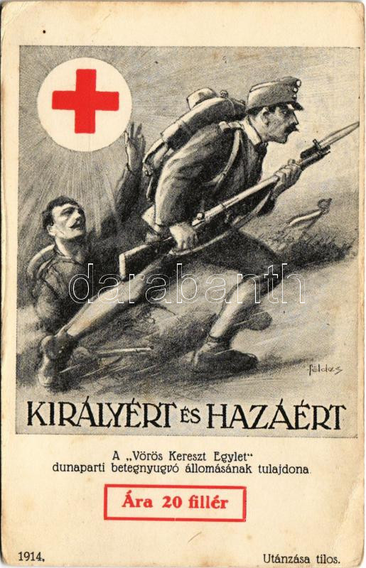 Királyért és Hazáért! A Vörös Kereszt Egylet dunaparti betegnyugvó állomásának tulajdona / WWI Austro-Hungarian K.u.K. military art postcard, Red Cross propaganda, support fund s: Földes (EK)