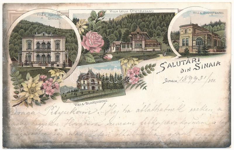 Beschreibung: 1899 (Vorläufer) Sinaia, Villa Alexandru Ghica, Villa Lelia Otetelesanu, Villa Blaremberg, Villa Budisteanu. Carol Müller Art Nouveau, floral, litho