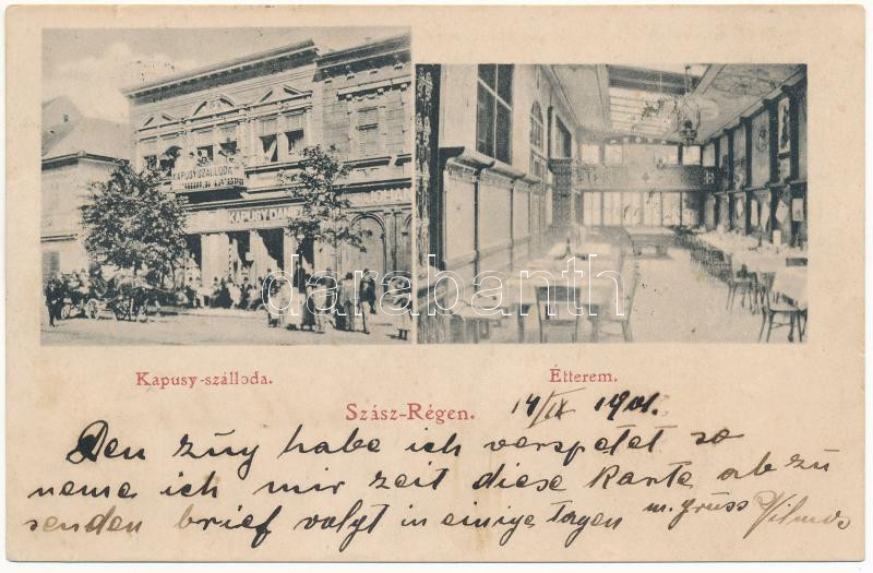 1901 Szászrégen, Reghin; Kapusy szálloda, étterem, belső / hotel and r... https://www.darabanth.com/de/434-Fernauktion/434.0/Ansichtskarten/Siebenburgen~2000005/1901-Szaszregen-Reghin-Kapusy-szalloda-etterem-belso-hotel-and-restaurant-interior-r~II2809203