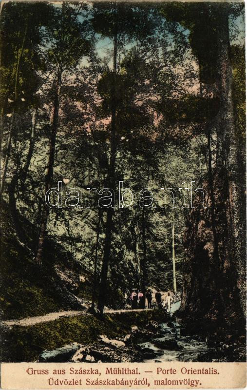 Beschreibung: Szászkabánya, Németszászka, Sasca Montana; Malomvölgy. Franz Krisch kiadása / Mühlthal / Porte Orientalis / valley (felületi sérülés / surface damage)