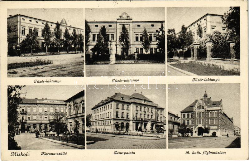 1941 Miskolc, Tüzér laktanya, Korona szálló, Római katolikus főgimnázi... https://www.darabanth.com/de/434-Fernauktion/434.0/Ansichtskarten/Ungarn~2000004/1941-Miskolc-Tuzer-laktanya-Korona-szallo-Romai-katolikus-fogimnazium~II2806818