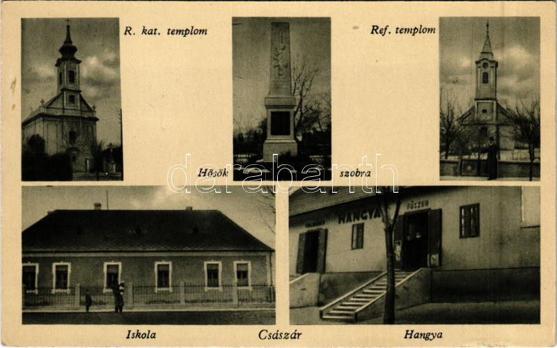 Beschreibung: 1944 Császár, Hősök szobra, Római katolikus és református templom, iskola, Hangya üzlete és saját kiadása