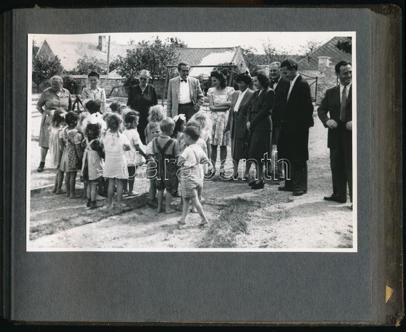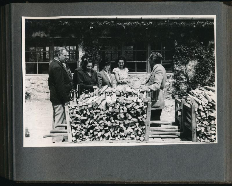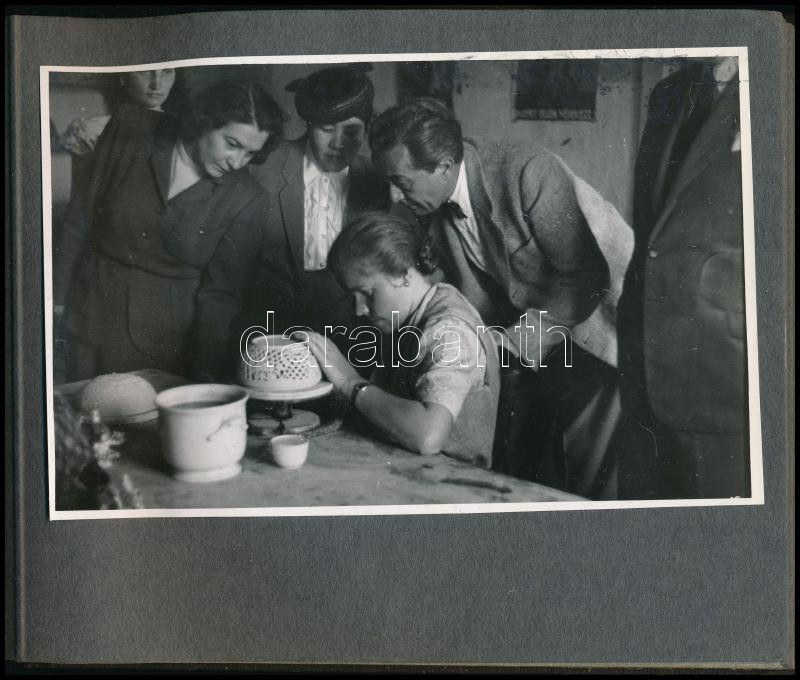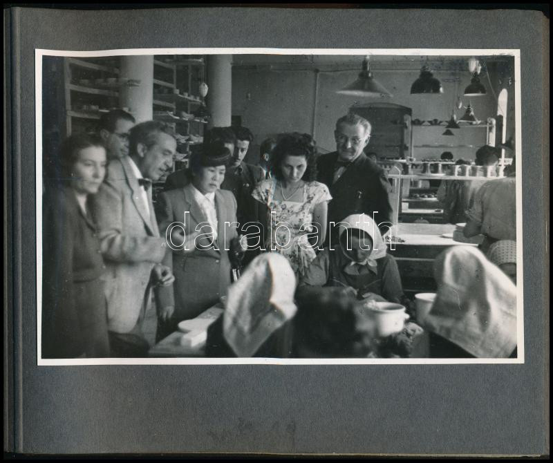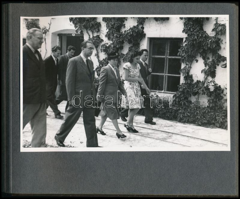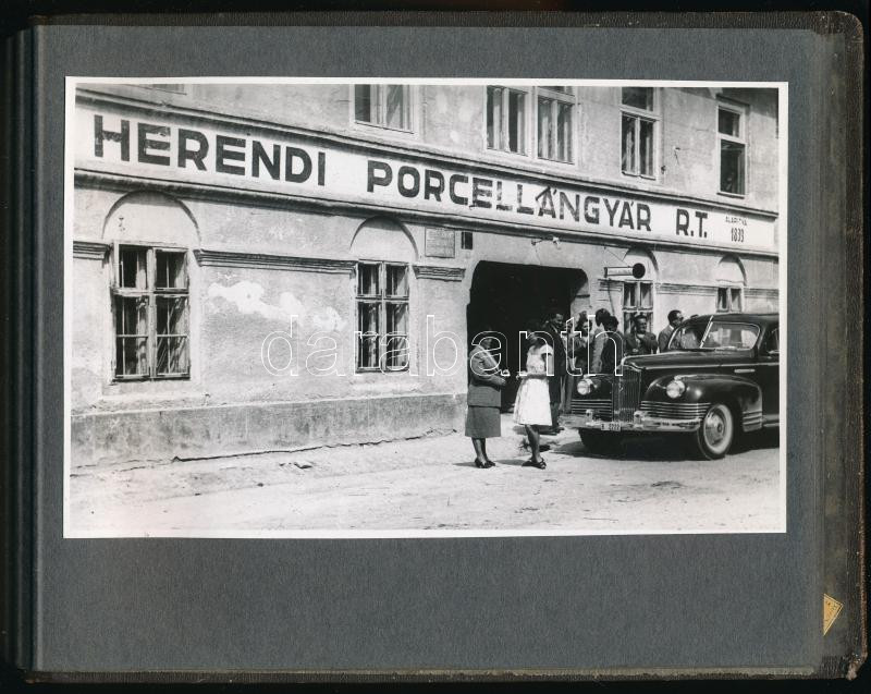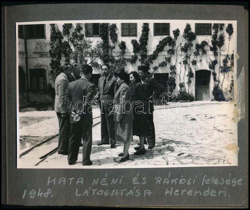 1948 Dinnyés Lajos (1901-1961) kisgazda politikus, miniszterelnök feleségének, Hegedűs Katalinnak és Rákosi Mátyás (1891-1971) kommunista politikus, későbbi miniszterelnök és az MDP főtitkárának a feleségének, Fenya Fjodorovna Kornyilovának a látogatása Herenden, benne a porcelángyárban készült fotókkal is, valamint a két "látogató" és a testőr békés piknikezésével, családtag által feliratozva, 24 db fotó, haránt-alakú, fűzött fotóalbumban, 12x18 cm és 11x18 cm között méretben