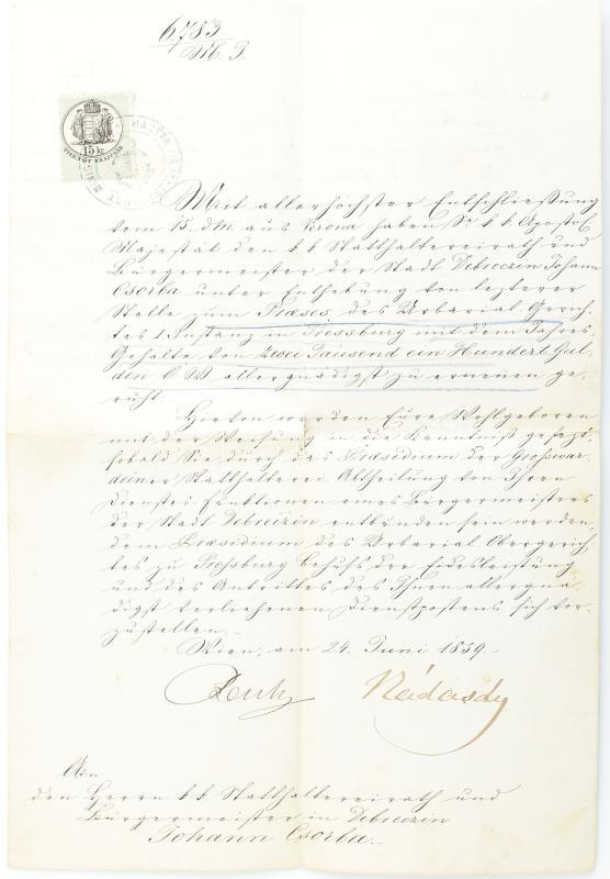Beschreibung: 1859 Bach belügyminisztériuma által kiállított úrbéri törvényszéki ítélet Nádasdy aláírással