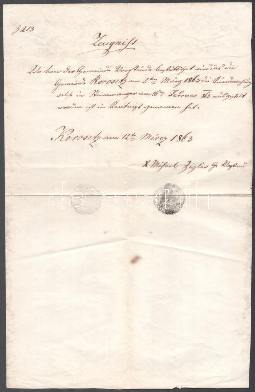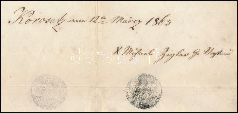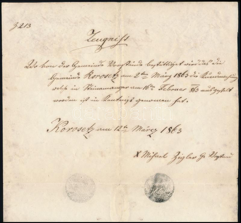 1863 Korosecz (Károlyfa, ma: Korovci, SL), Zigler Mihály községi elöljáró német nyelvű igazolása egy szombathelyi hirdetmény kézhezvételéről, a község szignettájával /