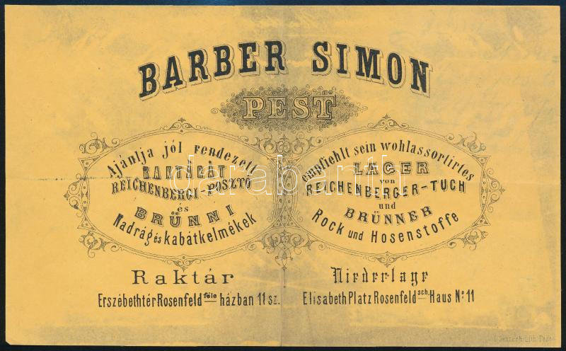 1870 Pest, Erzsébet tér 11. sz. Barber Simon posztó, nadrág, stb. rakt... https://www.darabanth.com/de/434-Fernauktion/434.0/Kunst-Dokumente-andere-Sammelgebiete/Dokument~500020/1870-Pest-Erzsebet-ter-11-sz-Barber-Simon-poszto-nadrag-stb-raktar-ketoldalas-szamla-2~II2809012