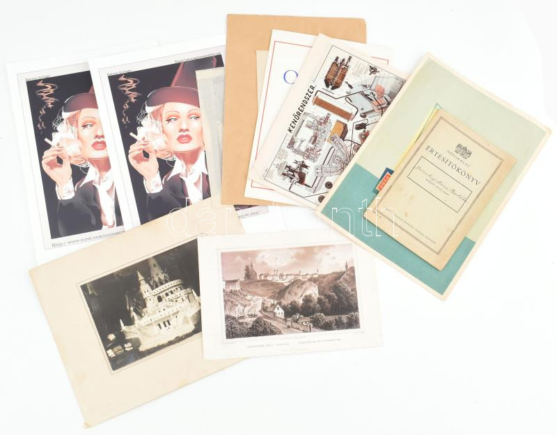 Beschreibung: Vegyes papírrégiség tétel, 11 db (népiskolai értesítő, oklevelek, modern nyomatok, stb.)