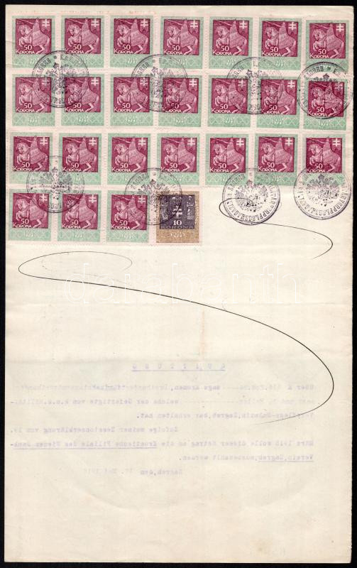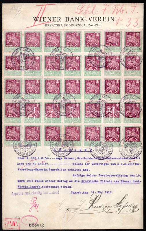 Beschreibung: Zágráb 1916 Katonai vonatkozású nyugta 315.208K összegről 2.960K értékű 60 db okmánybélyeggel. Látványos darab!