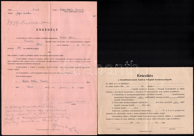 Beschreibung: cca 1950 Engedély szőlőtőke kivágására + értesítés tartozás fejében lefoglalt borról