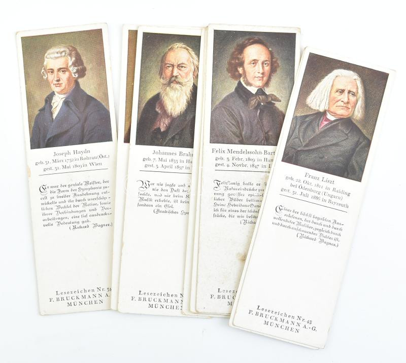 Beschreibung: 10 db régi könyvjelző a müncheni F. Bruckmann könyvkiadó cégtől, hírességek, zeneszerzők, festők képével, pl. Liszt Ferenc